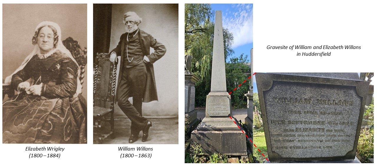 - Elizabeth, the second child, married William Willans (*27 April 1800, Leeds, †4 September 1863, Harrogate, ΩEdgerton Cemetery, Huddersfield), son of Benjamin Wrigley (1771 – 1855) and Sarah Howarth (1772 – ?), on 25 May 1825 at Almondbury.1,2,8,22,36,37 William ran a successful wool-trading business in Huddersfield. Apparently Elizabeth went blind some years before her death in 1884.1,2 READ HERE the transcribed announcement and details of William Willans’ death as it appeared in various newspapers.