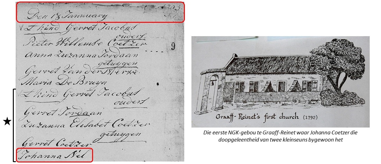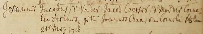 NOTA: Cornelia Helm word as Jan Coetzer se moeder én as doopgetuie aangeteken. Hierdie was moontlik ‘n notuleringsfout en daarom word geraai dat Aletta van Wyk eintlik as getuie teenwoordig was. Johannes Craaij was reeds vanaf 21 Oktober 1714 getroud met Aletta van Wyk, dogter van Cornelia Helms uit haar eerste huwelik met Adriaan van Wyk (1668 – 1713). Aletta van Wyk was dus Jan Coetzer se half-suster, en was twintig jaar sy senior.