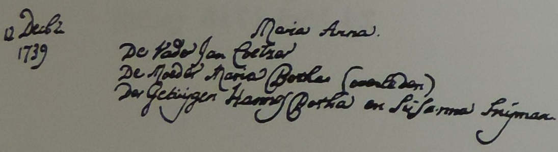 Maria was die enigste kind wat gebore is uit Jan se eerste huwelik. Haar moeder is kort na haar geboorte oorlede. Sy is op 12 Desember 1739 gedoop in die NGK Drakenstein, waar (Jo)Hannes Botha (ca 1719 – ?), haar 20-jarige eerste neef, en haar stiefouma, Susanna Snyman (1703 – 1763) as doopgetuies opgetree het.1-3,10,24,25 Waarom haar oupa, Jacob Coetzer (1686 – 1742) nie teenwoordig was nie, is onbekend. Moontlik was hy te sieklik – hy is twee jaar later oorlede – en het Hannes Botha sy tante in sy oom se plek vergesel.