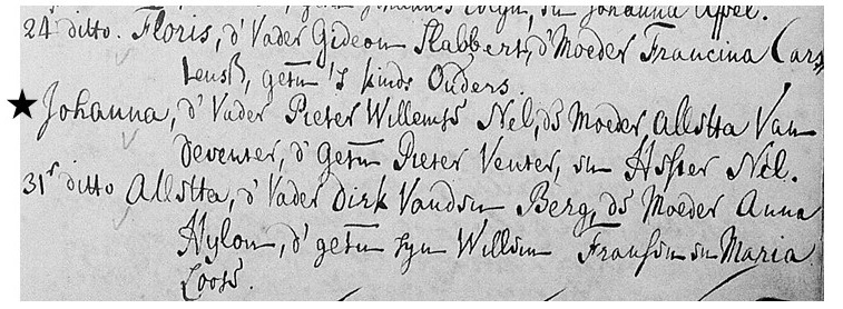 11. Doopinskrywing van Johanna Nel. South Africa, Dutch Reformed Church Registers (Cape Town Archives), 1660-1970, database with images, FamilySearch (https://familysearch.org/ark:/61903/3:1:S3HY-DZN4-WH1?cc=1478678&wc=M6GW-82S%3A49605401%2C49605402%2C49605403%2C49608601 : 21 May 2014), South Africa > Cape of Good Hope > Cape Town > Baptisms 1713-1741 > image 34 of 109; State Archives, Cape Province