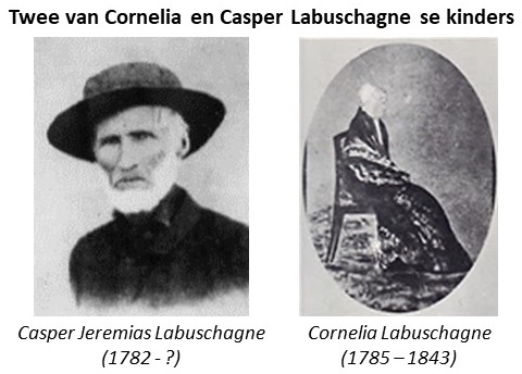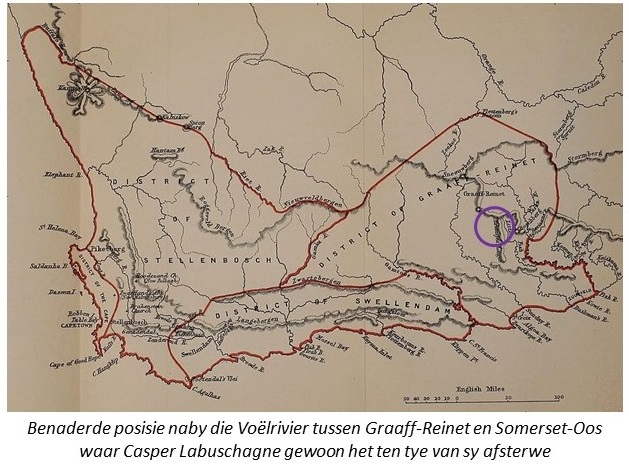 Dis nie seker waar Cornelia en Casper Labuschagne in Stellenbosch distrik gewoon het nie, maar Casper het later in die laat 1780’s uitgewyk na Graaff-Reinet grensdistrik,3,32,39 waarvandaan van hul kinders en kleinkinders gedurende die laat 1830’s aangesluit het by die groot uittog van vryburgers uit die Britse Kaapkolonie.16,36,37 Cornelia Labuschagne is in 1785 oorlede (waarskynlik in Stellenbosch distrik of oppad na Graaff-Reinet distrik) toe sy net 36 jaar oud was, en Casper in 1792 op 46-jarige ouderdom op die plaas Verstoke fonteijn oor die Vogel Rivier (Voëlrivier), wat nog op die naam van Johannes Frederik Botha geregistreer was. Al wat die Labuschagne-gesin toe op hul naam gehad het, was een ossewa met toebehore, eetgerei, twee bottervate, vier emmers, ses potte, twee kiste, twee beddens, een ou tafel, vyf gewere, een ou perd, 245 beeste en 1800 skape. Die oudste kind was 21 jaar oud en die jongste slegs ses jaar, toe hulle wees gelaat is.3,32,39 Hulle is waarskynlik deur die naaste familielede in versorging geneem.