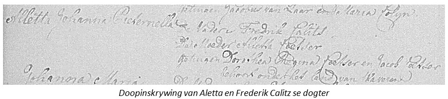 50. Doopinskrywing van Aletta Johanna Petronella Calitz. South Africa, Dutch Reformed Church Registers (Cape Town Archives), 1660-1970 ,” database with images, FamilySearch (https://familysearch.org/ark:/61903/3:1:S3HY-DZN4-W1B?cc=1478678&wc=M6GW-8NP : 21 May 2014), South Africa > Cape of Good Hope > Cape Town > Baptisms 1757-1779 > image 91 of 145; State Archives, Cape