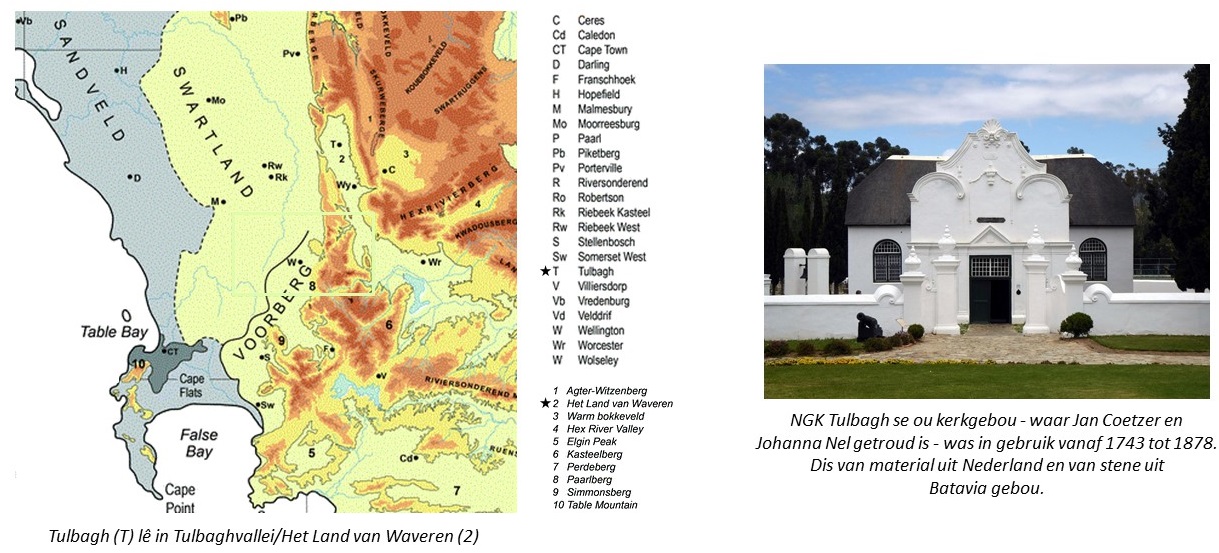 Uit gegewens lyk dit asof Jan Coetzer as jong volwassene ten tye van sy eerste huwelik reeds woonagtig was in die Het Land van Waveren, waarna sy nuwe vrou ook kerklidmaatskap in die die kerk daar ontvang het.2 Roodezandskerk in ‘t Land van Waveren is in 1804 na NGK Tulbagh herdoop. Die oorspronklike NG Kerkgebou, ook bekend as De Oude Kerk, is vandag ‘n kultuurhistoriese museum.15 Dit is in 1743 gebou en het die amptelike stigting van die dorpie Tulbagh verteenwoordig, wat na die Kaapse goewerneur Ryk Tulbagh (dienstydperk: 1751 – 1771) vernoem is.15,16 Die dorp Tulbagh – ongeveer 180 km noord-oos van Kaapstad – is geleë in die Tulbaghvallei, wat oorspronklik bekend was as Roodezand (wat ‘rooi sand’ beteken), maar later in 1699 herdoop is na ‘t Land van Waveren (Het Land van Waveren) deur Willem Adriaan van der Stel, wat die goewerneur was aan die Kaap de Goede Hoop vanaf 1699 tot 1707. Voordat Hollandse en Hugenote settelaars hulself in die streek kom vestig het vanaf 1700, was daar reeds ‘n handels- en verversingpos wat deur binnelandse jagters gebruik is. Daar was blykbaar met dierevelle, wildsvleis en olifanttande in hierdie omgewing handel gedryf.16-19