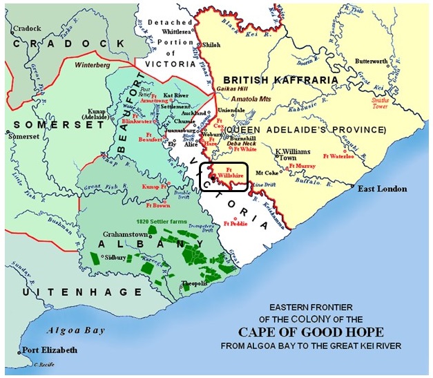 Kwaai Willem is in 1828 oorlede naby Fort Wiltshire 3,54 aan die oosgrens van Albany distrik (voorheen deel van Graaff-Reinet/Uitenhage distrik, later deel van Victoria distrik). Die fort was ‘n militêre versterking teenaan die Xhosa oosgrensgebied wat in 1835 as Queen Adelaide’s Province (later herdoop na British Kaffraria) vir die Britse Kaappkolonie geannekseer is. Die fort is gedurende die Vyfde Kaapse Grensoorlog (of Vyfde Xhosa Oorlog) van 1818 tot 1819 deur Britse militêre troepe van die 38th Royal Regiment onder leiding van Luit.-Kol. Thomas Wiltshire opgerig.15,55,56 Gedurende die 1830’s is periodieke markte by die fort gehou waar Europese settelaars en inheemse Ngqika Xhosas handel gedryf het met ivoor, diervelle, mandjies, skape en beeste, gereedskap, komberse, katoenmateriale, krale, metaaldraad en -implemente, en ander nuttighede.55