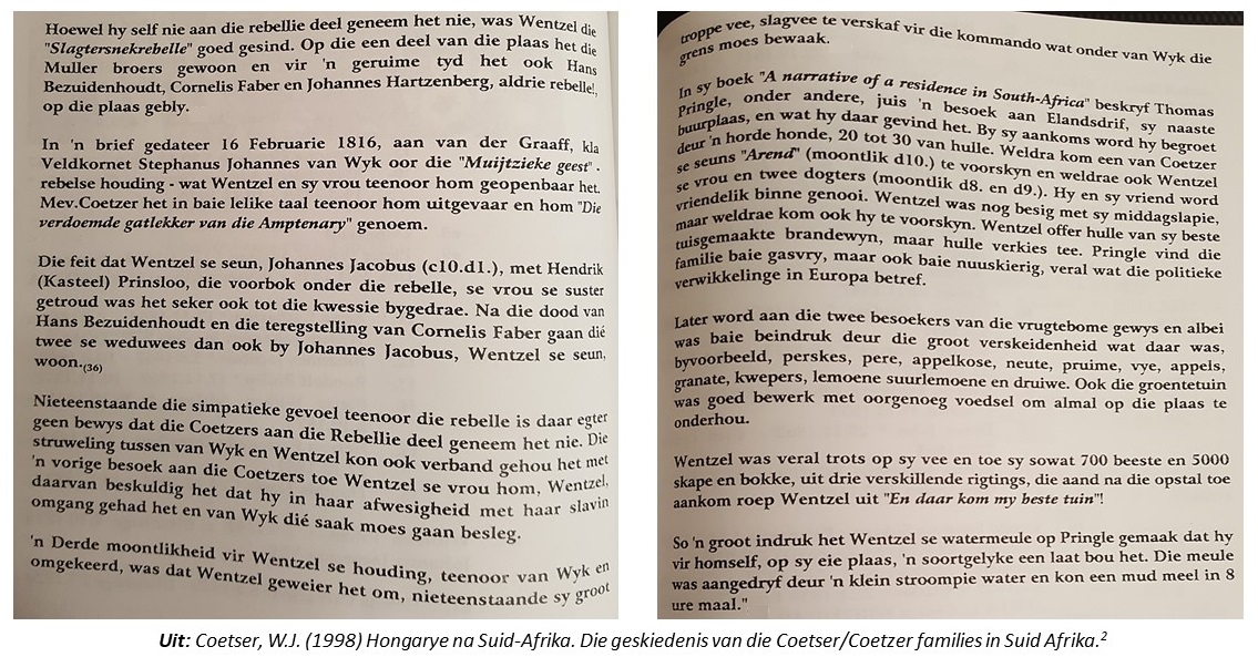 2. Coetser, W.J. 1998 Hongarye na Suid-Afrika. Die geskiedenis van die Coetser/Coetzer families in Suid Afrika. 1ste Ed. HE Printers: Escourt, Natal