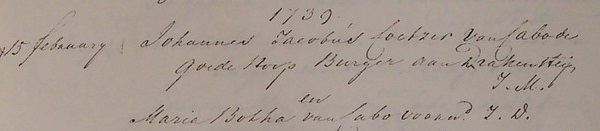 Jan het as ‘n jongman van 23 jaar op 15 Februarie 1739 in NGK Drakenstein met Maria Botha in die huwelik getree.1-3 Sy was die dogter van Johannes Botha (≈1 Mei 1695 – 19 Mei 1779) en Anna van der Merwe (≈20 Mei 1704 – 7 April 1739). Maria was die oudste van twaalf kinders en is op 29 Maart 1722 in NGK Drakenstein gedoop.8-10
